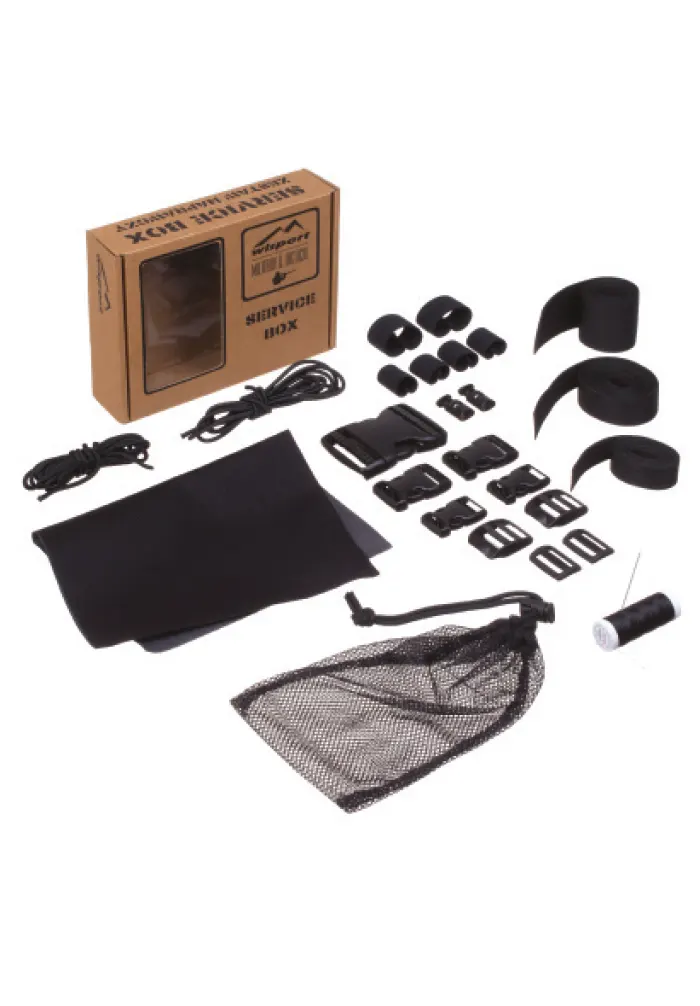 gb The box contains the most necessary materials that can be useful in the event of equipment failure. All items can be carried in a handy pouch. The color of the set is chosen according to the color of the fabric.