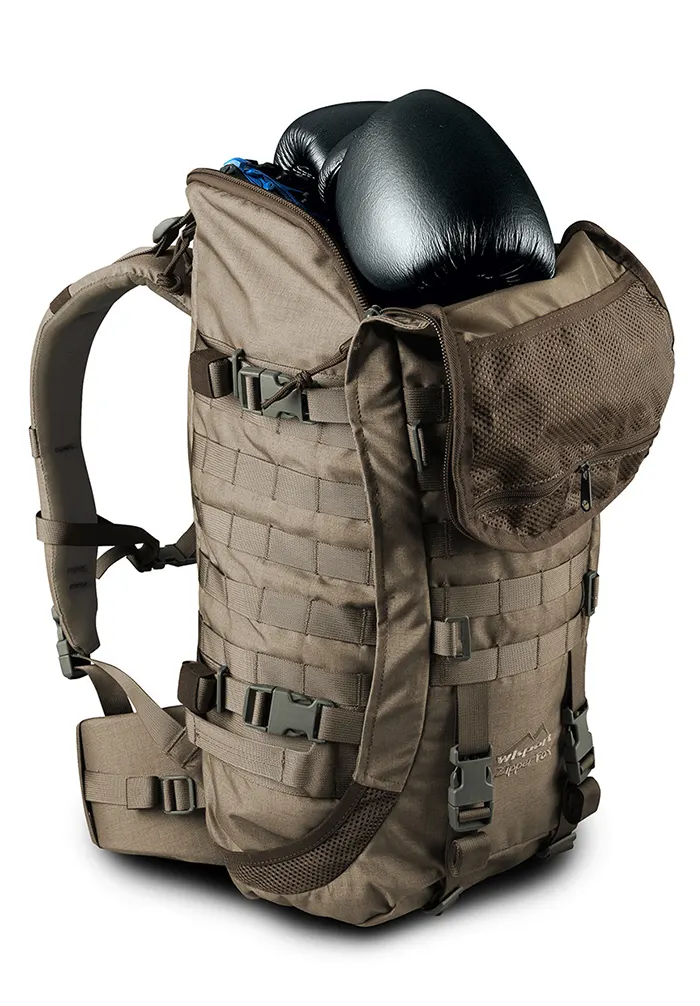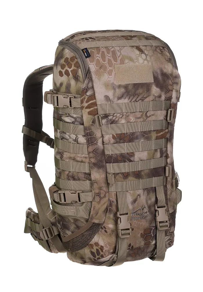 Plecak militarno-survivalowy, do którego dostęp zapewnia zamek w kształcie odwróconej litry U.